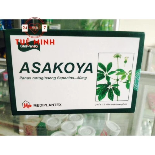 - Asakoya 50mg là sản phẩm được sản xuất tại Công ty dược phẩm Mediplantex. Với các thành phần có sẵn trong sản phẩm thì Asakoya 50mg sẽ giúp điều trị mất ngủ, hồi hộp, tim đập nhanh hiệu quả.