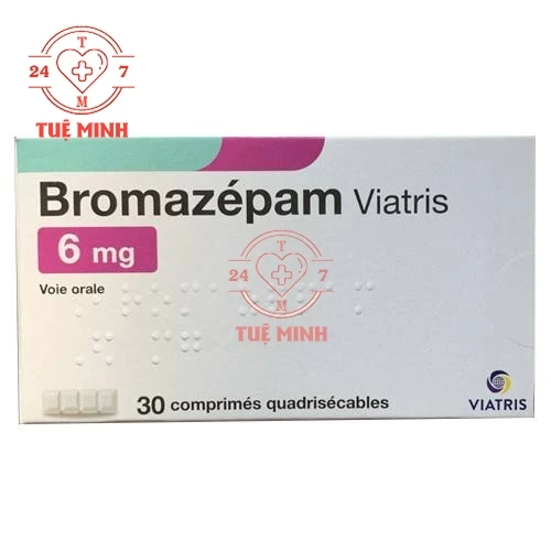 Bromazepam Viatris 6mg là thuốc nhập khẩu Mỹ, thuộc nhóm thần kinh, chuyên điều trị các tình trạng lo âu, căng thẳng, rối loạn cảm xúc, mất ngủ. Cần lưu ý, thuốc này không có công dụng điều trị bệnh trầm cảm. Bromazepam - một hoạt chất có tác dụng chống lo âu là thành phần chính của thuốc này. Nó hoạt động tương tự như diazepam. Bromazepam Viatris 6mg bắt buộc phải dùng đúng liều lượng, đúng thời gian để mang tới hiệu quả tích cực nhất. Tuyệt đối không được lạm dụng thuốc vì có thể gây nên những tác dụng phụ nguy hiểm cho sức khỏe như: tiểu không kiểm soát, đau đầu, chóng mặt, run rẩy,...
