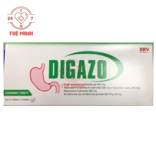 - Digazo là thuốc hỗ trợ điều trị các triệu chứng liên quan đến dạ dày và tiêu hóa, với thành phần chính bao gồm Aluminum hydroxide 400mg, Magnesium carbonate 400mg, và Simethicone 40mg. Thuốc được sử dụng để làm dịu các triệu chứng do tăng acid dạ dày, như chứng ợ nóng, ợ chua và đầy bụng khó tiêu. Ngoài ra, Digazo còn được chỉ định trong việc phòng ngừa và điều trị loét dạ dày tá tràng do stress, cũng như hỗ trợ điều trị triệu chứng trào ngược dạ dày - thực quản. Bài viết này sẽ cung cấp thông tin chi tiết về công dụng, liều dùng và các lưu ý khi sử dụng thuốc Digazo.