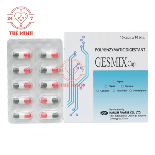 - Gesmix là thuốc được sản xuất tại Hàn Quốc bởi hãng dược phẩm Hanlim Pharmaceutical Co., Ltd. Thuốc Gesmix có tác dụng điều trị rối loạn tiêu hóa mỡ, protein & carbohydrate, nhờ công dụng của thuốc mà bệnh nhân sẽ không còn phải lo về vấn đề rối loạn tiêu hóa nữa.